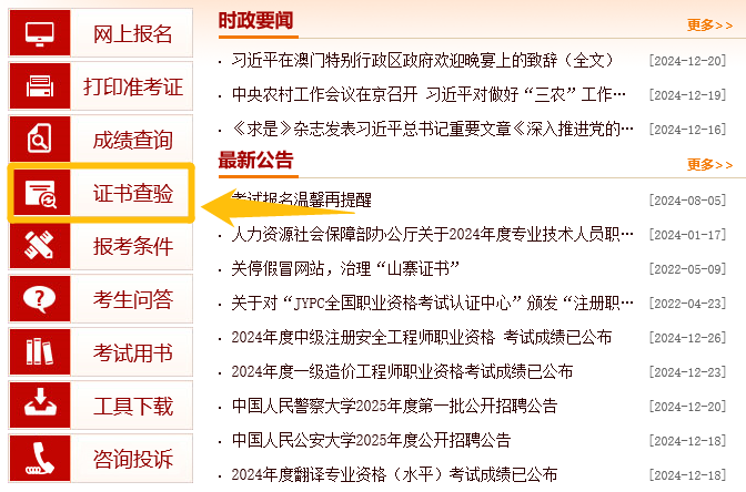 访问中国人事考试网(网址:http://www.cpta.com.cn/)首页,点击左侧菜单中的【证书查验】。