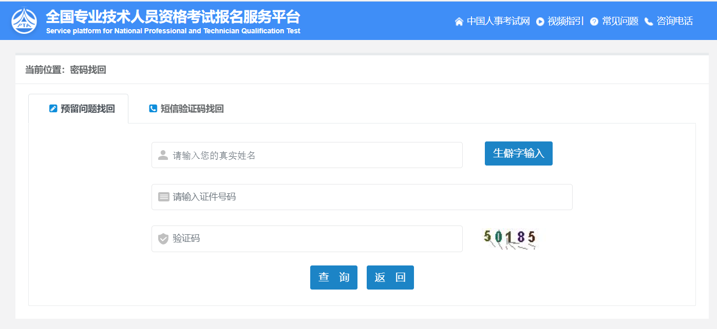 第一种:通过输入姓名,证件号码点击【查询】按钮,查询出考生填写的密码找回问题,填写正确答案后,跳转到密码重置界面浏览注册用户名,并设置新密码;