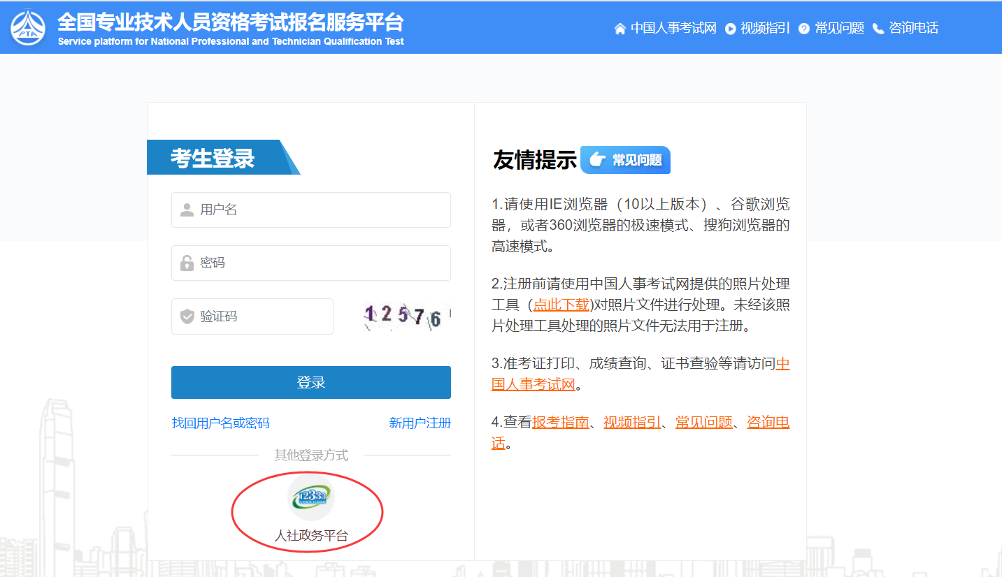 第三种:通过点击登录页面的“其他登录方式”——“人社政务平台”通过人社政务平台登录到系统后,进行密码重置。