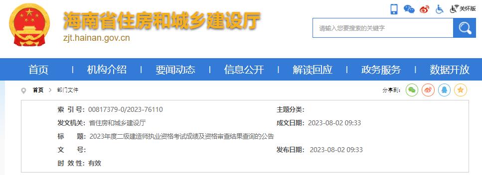 根据海南省住房和城乡建设厅 中共海南省委人才发展局《关于做好2023年度二级建造师执业资格考试工作的通知》,现向社会公布考试成绩及资格审查结果,对考试成绩及资格审查有异议的考生请于公告期内向省住房和城乡建设厅提出复核申请。