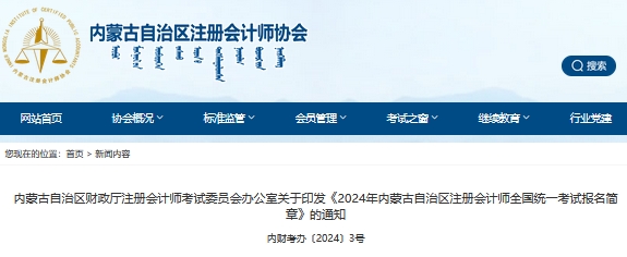 根据财政部注册会计师考试委员会《2024年注册会计师全国统一考试报名简章》,结合我区实际情况,内蒙古自治区财政厅注册会计师考试委员会办公室制定《2024年内蒙古自治区注册会计师全国统一考试报名简章》,现予印发。