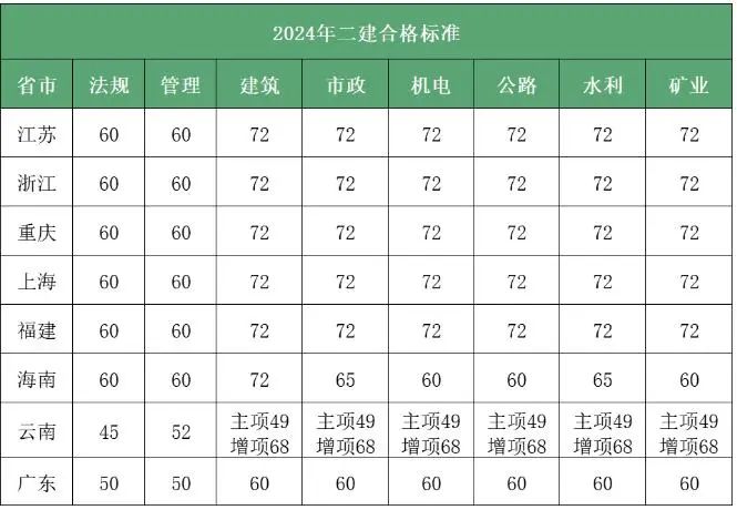 二级建造师合格标准是各省自行划分的,因此不同省份的合格标准有所不同。2024年二级建造师考试大纲有所调整,根据2024二级建造师最新大纲的要求,其中《建设工程施工管理》满分分值为100分,《建设工程法规及相关知识》满分分值为100分,《专业工程管理与实务》满分分值为120分。根据相关规定,二级建造师各科目的合格分数线,不会超过各科目满分的60%,因此《建设工程施工管理》的合格分数线最高不超过60分,《建设工程法规及相关知识》的合格分数线最高不超过60分,《专业工程管理与实务》的合格分数线最高不超过72分,具体各省的合格分数线需要以发布的合格标准通知为准。