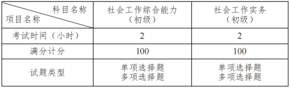 1.助理社会工作师:考试科目为2门,即《社会工作综合能力(初级)》《社会工作实务(初级)》。各科目考试试题类型及时间如下: