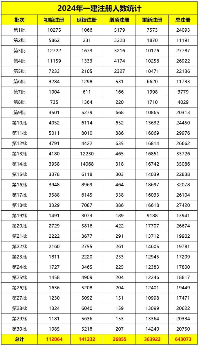 截止目前,住建部共公布了30批一建注册人员名单,总共643073人通过注册。其中,初始注册人数为112064人,占比17.42%。具体如下: