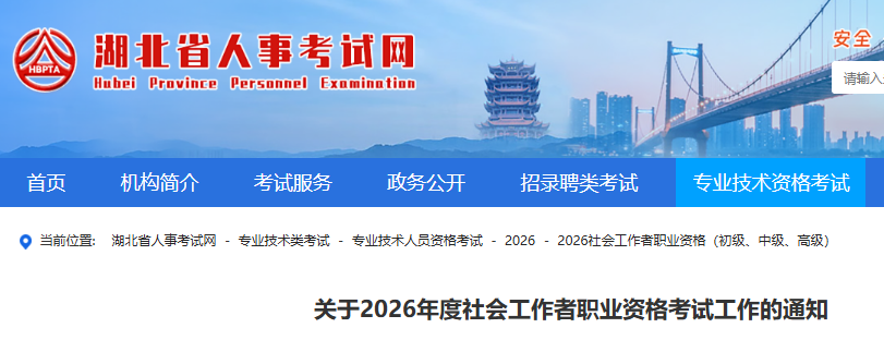 根据人力资源和社会保障部人事考试中心《关于做好2026年度社会工作者职业资格考试考务工作的通知》(人考中心函〔2026〕2号)精神,为做好我省2026年度社会工作者职业资格考试工作,现就有关事项通知如下: