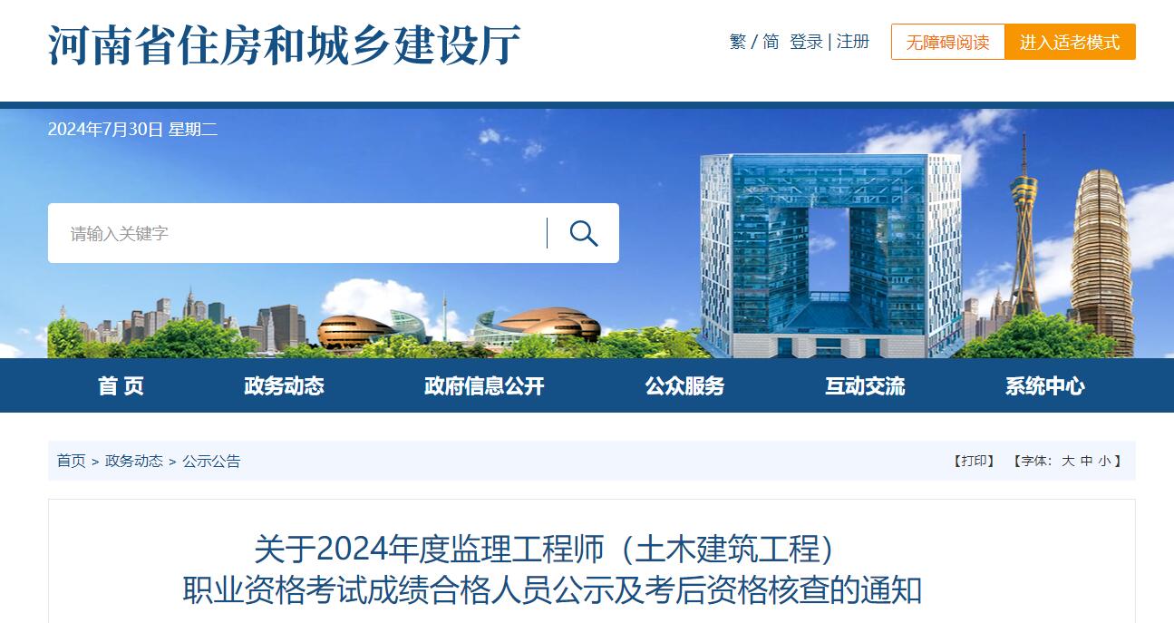 7月29日,河南省住房和城乡建设厅发布了“关于2024年度监理工程师(土木建筑工程)职业资格考试成绩合格人员公示及考后资格核查的通知”,按照有关要求,现对考试成绩合格人员予以公示,接受社会监督。公示期为2024年7月29日至2024年8月9日。