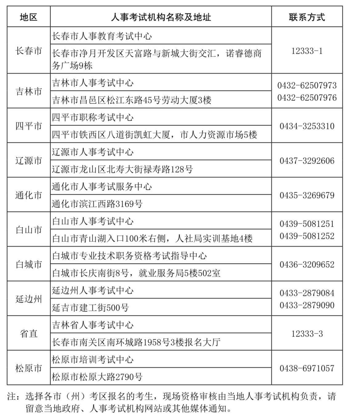 吉林省人事考试机构现场人工核查地点及联系方式