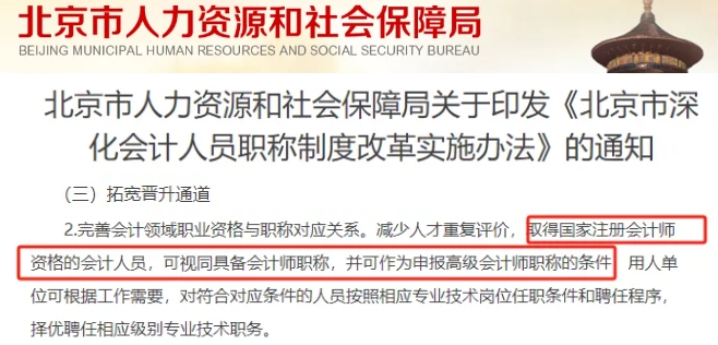 北京市人力资源和社会保障局关于印发《北京市深化会计人员职称制度改革实施办法》的通知,明确指出: