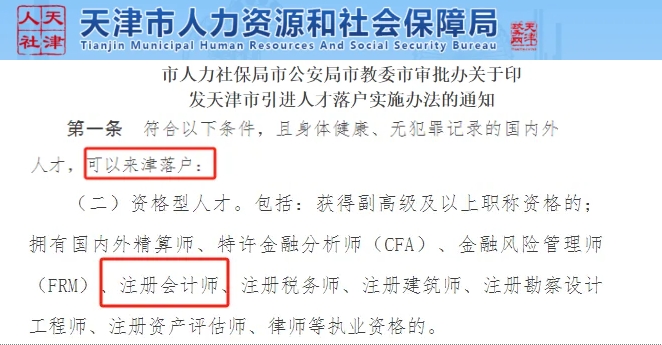根据《天津市“海河英才”行动计划》第二条,取得注册会计师证书的资格型人才可直接落户天津。