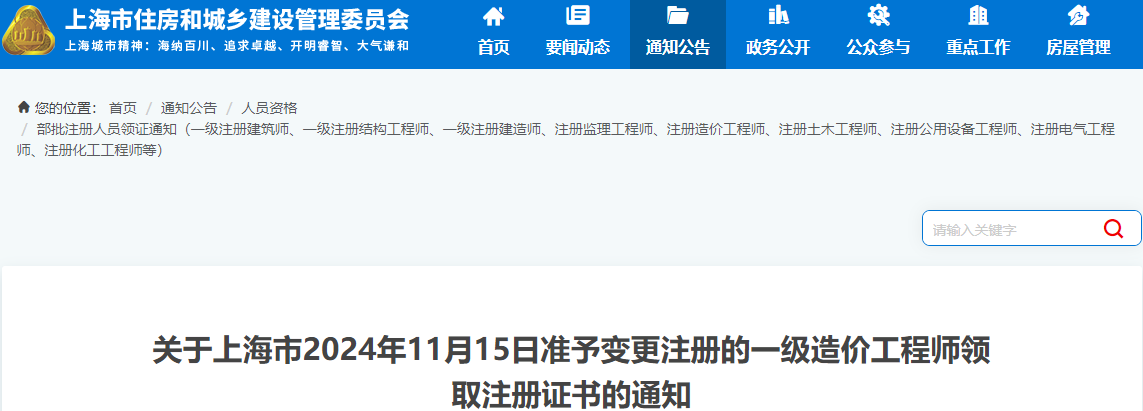上海市2024年11月15日准予变更注册的一级造价师领取注册证书通知原文如下: