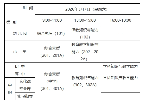 2026上半年教师资格证考试时间已公布,笔试定于3月7日举行。具体科目时间如下: