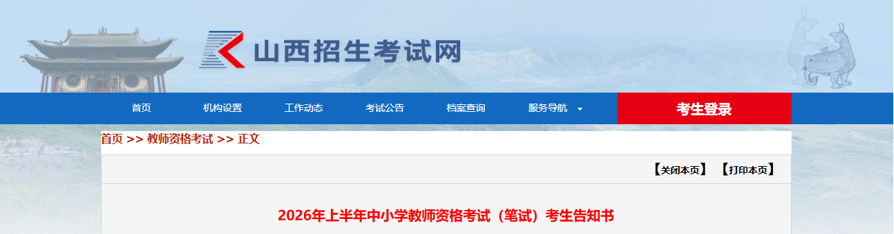 2月27日,山西招生考试网发布了“2026年上半年中小学教师资格考试(笔试)考生告知书”,2026年上半年中小学教师资格考试(笔试)将于3月7日举行,考生请于2026年3月2日-7日登录“中小学教师资格考试网”打印准考证。
