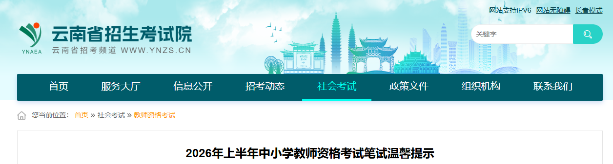 2026年上半年中小学教师资格考试笔试将于3月7日举行。请在云南省参加考试的考生严格遵守考试纪律,知法、守法,诚信考试、拒绝作弊。为确保考试平稳顺利进行,现将有关事项提示如下: