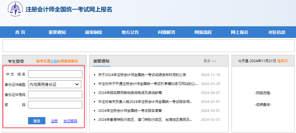 第一步:进入注册会计师全国统一考试网上报名系统(https://cpaexam.cicpa.org.cn/),输入姓名、身份证号、密码;