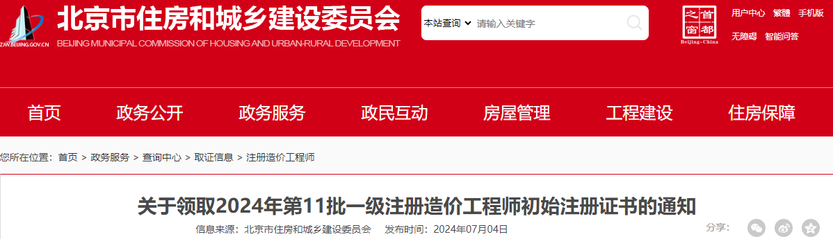 2024年7月4日,北京市住房和城乡建设委员会发布了《关于领取2024年第11批一级注册造价工程师初始注册证书的通知》,其中明确北京市一级造价师初始注册证书已办结,相关人员可进行现场领证。