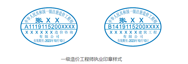 (二)造价工程师执业印章内容包括:造价工程师注册级别、姓名、执业印章编码、聘用单位名称、印章的有效期;