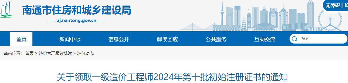 南通市2024年一级造价师第十批初始注册证书领取通知原文如下: