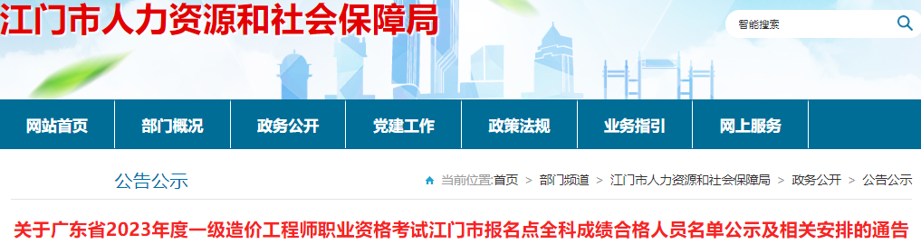 2024年1月2日,江门市人力资源和社会保障局发布了《关于广东省2023年度一级造价工程师职业资格考试江门市报名点全科成绩合格人员名单公示及相关安排的通告》,对2023年江门一级造价师合格名单公示时间、证书发放事项等作出具体安排。