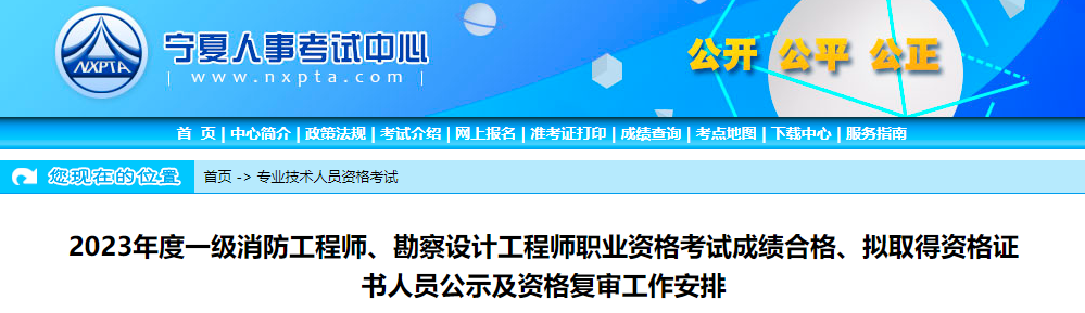 2024年1月23日,宁夏人事考试中心发布了《2023年度一级消防工程师、勘察设计工程师职业资格考试成绩合格、拟取得资格证书人员公示及资格复审工作安排》,其中明确部分宁夏一消成绩合格人员需进行考后审核,并对审核时间、地点、材料作出具体说明。
