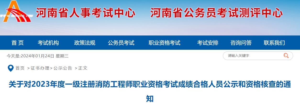 根据人力资源社会保障部《专业技术人员职业资格考试报名证明事项告知承诺制工作规程》(人考中心函〔2021〕1号)及河南省人力资源和社会保障厅《关于专业技术人员职业资格考试资格核查和证书发放管理有关具体问题的通知》(豫人社函〔2020〕40号)等文件要求, 现就2023年度一级注册消防工程师职业资格考试成绩合格人员进行公示和考后资格核查事项通知如下: