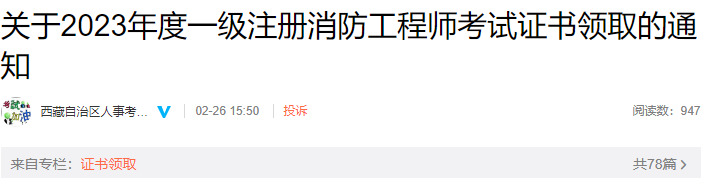 西藏2023年度一级消防工程师证书领取通知原文如下: