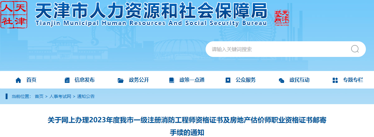 为满足广大考生需要,减少考生往返路程和排队等候,天津市人才考评中心与中国邮政速递物流股份有限公司天津市分公司合作,开通2023年度我市一级注册消防工程师资格证书及房地产估价师职业资格证书邮政EMS寄递业务。具体事项通知如下: