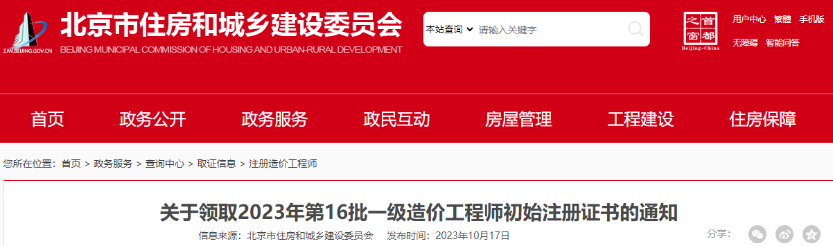 2023年10月17日,北京市住房和城乡建设委员会发布了《关于领取2023年第16批一级造价工程师初始注册证书的通知》,其中明确2023年第十六批一级造价师初始注册证书已办结,相关人员可进行现场领证。