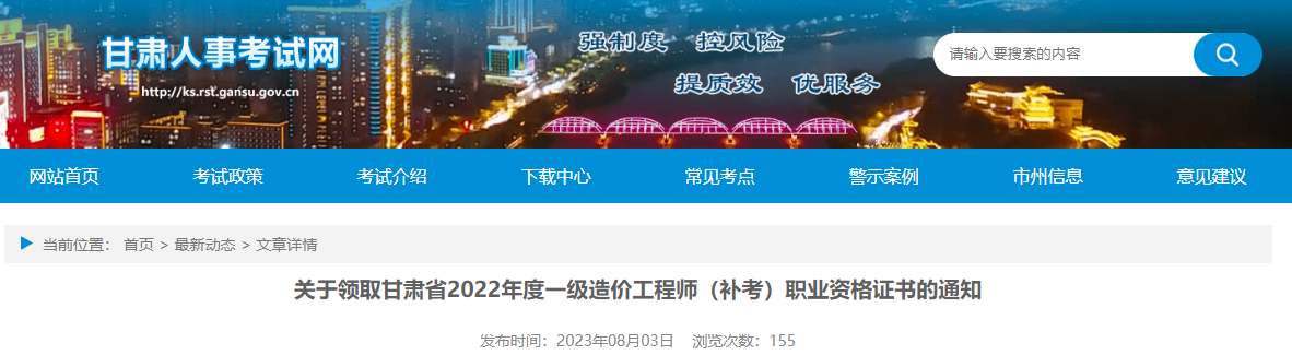 2023年8月4日,甘肃人事考试网发布了《关于领取甘肃省2022年度一级造价工程师(补考)职业资格证书的通知》,对2022年度甘肃一级造价师证书领取方式、地点、流程等事项作出具体安排。