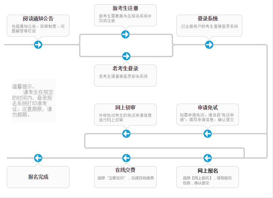 非首次报名人员,登录“网报系统”,核对个人信息。进入“考生信息采集”页面,逐项按要求核对、填写,如信息有变动的,应更正更新。选定报考科目并完成交费。