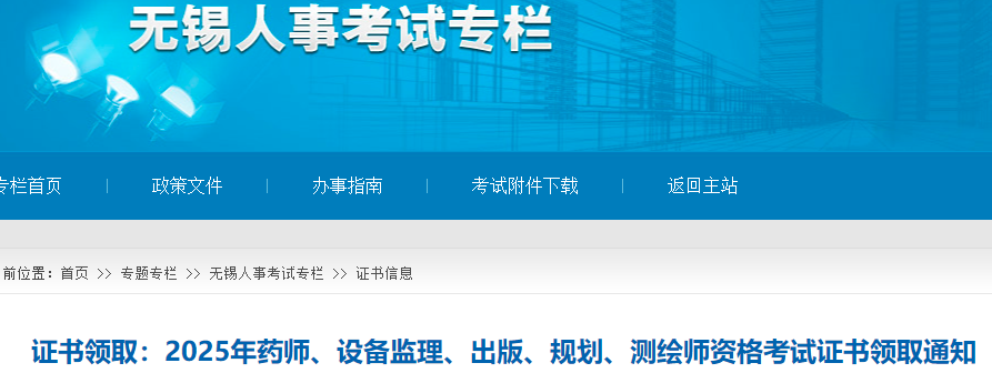 根据无锡市人力资源和社会保障局发布的“证书领取:2025年药师、设备监理、出版、规划、测绘师资格考试证书领取通知”,2025年江苏无锡执业药师证书已发放,请考试合格人员尽快领取。详情如下: