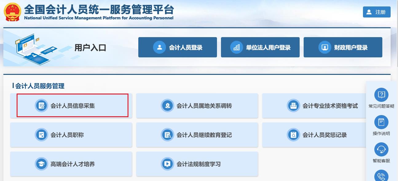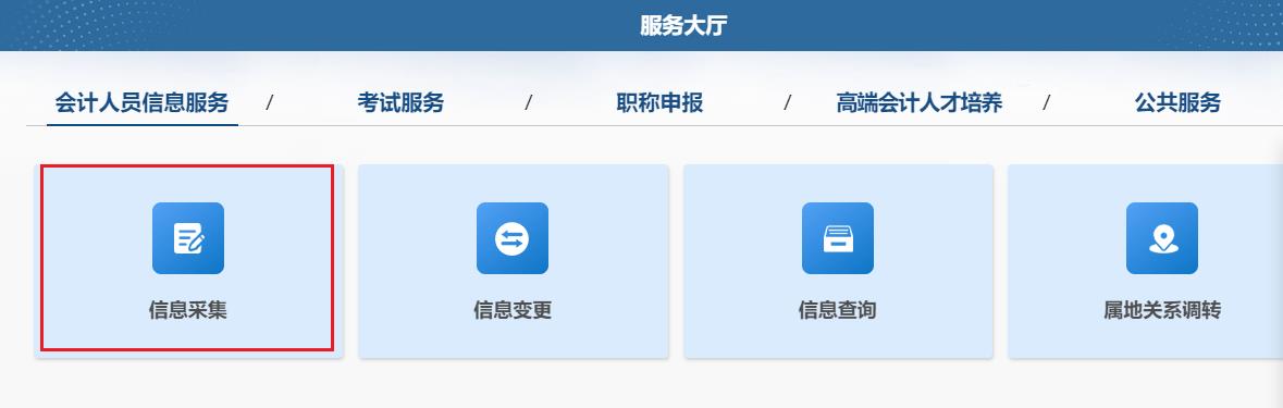 第一步:注册、登录全国会计人员统一服务管理平台后,点击首页的会计人员信息采集进入到信息采集页面,或者会计人员信息服务下的信息采集。