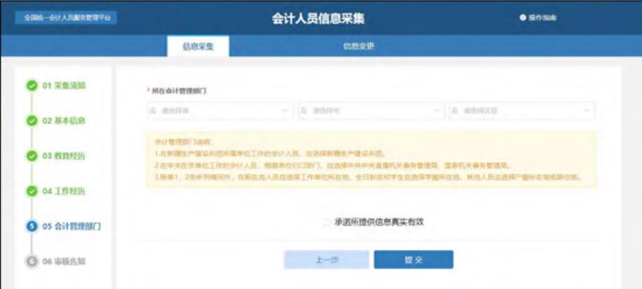 第六步:工作经历页面点击下一步,进入到会计管理部门页面。在会计管理部门页选择所在会计管理部门省、市、区县。关系到后续信息采集审核等一系列操作,请认真核对后,勾选“承诺所提供信息真实有效”后提交审核。