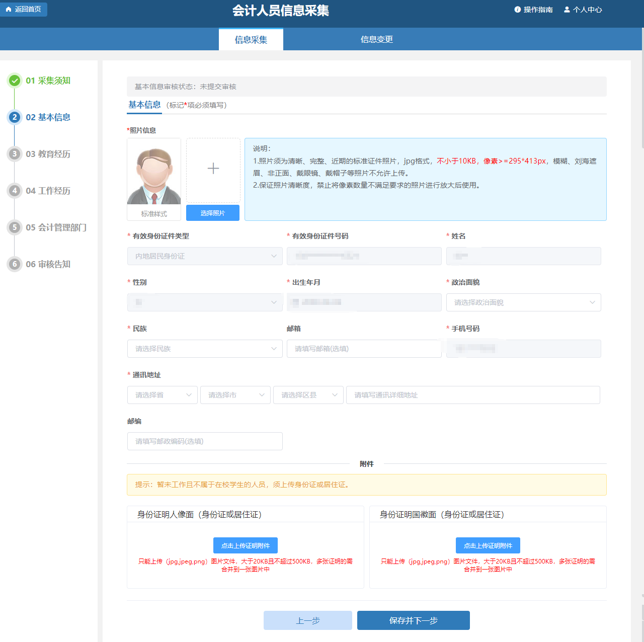 第三步:采集须知页点击下一步进入到基本信息页。在基本信息页中需要上传清晰、完整、近期的标准证件照片,并且要求不小于 10KB,像素>=295*413px,请仔细阅读上传照片框右侧的说明。基本信息中有效身份证件类型、有效身份证件号码、姓名、性别、出生年月以及手机号码为注册时所填信息,基本信息页不可修改。在填写完整基本信息后点击下一步,进入到教育经历页。