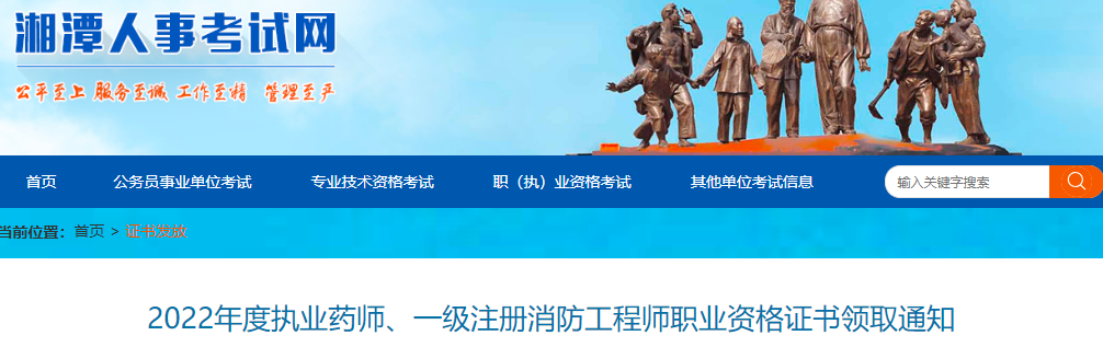 近日,湘潭人事考试网发布了《2022年度执业药师、一级注册消防工程师职业资格证书领取通知》,对湘潭市2022年度一级消防工程师证书领取方式、时间、流程、地点等事项作出具体安排。