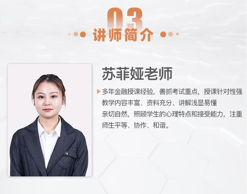 苏菲娅 多年金融授课经验,善抓考试重点,授课针对性强 教学内容丰富、资料充分、讲解浅显易懂 亲切自然,照顾学生的心理特点和接受能力,注重师生平等、协作、和谐;
