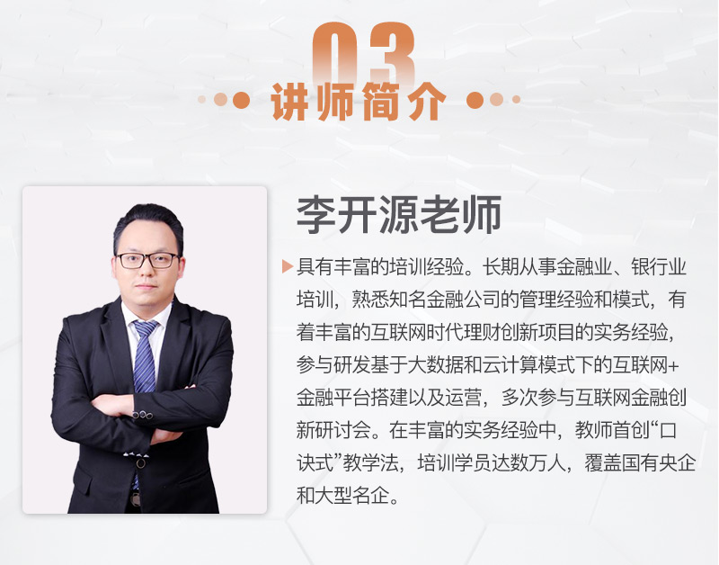 李开源 主讲基金从业考试,武汉大学金融硕士。独创口诀式记忆法,快速抓住核心考点。授课内容幽默风趣,运用大量商业实例充实课程内容,寓教于乐;