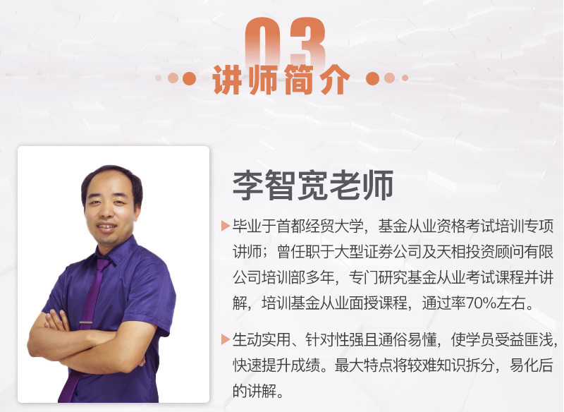 李智宽 李智宽,毕业于首都经贸大学,基金从业资格考试培训专项讲师;曾任职于大型证券公司及天相投资顾问有限公司培训部多年,专门研究基金从业考试课程并讲解,培训基金从业面授课程,通过率70%左右。授课风格独特,自成一脉,将专业的金融考试知识融合于课程内容当中,生动实用、针对性强且通俗易懂,使学员受益匪浅,快速提升成绩。最大特点将较难知识拆分,易化后的讲解