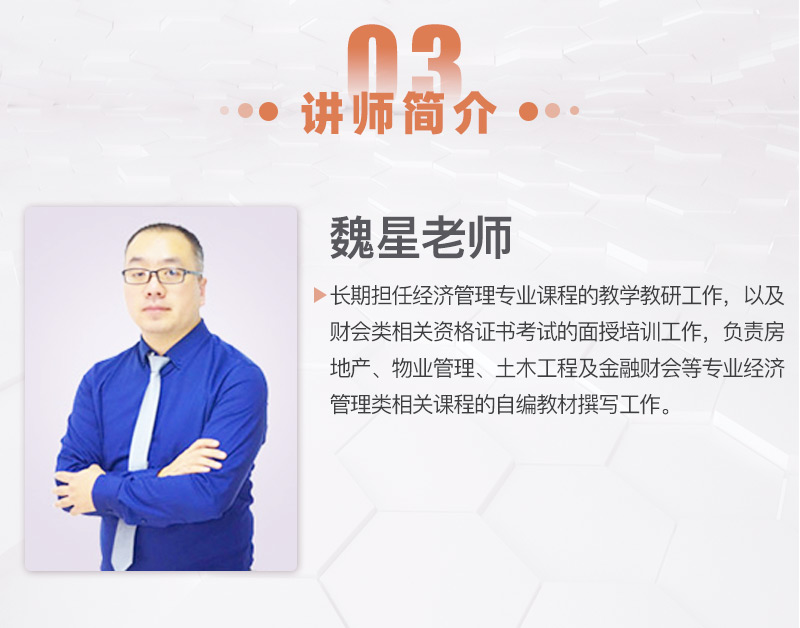 魏星 "对外经济贸易大学管理学博士 高校讲师、管理会计师、用友实践课程师资 兼任:中央财经大学、首都经济贸易大学客座讲师;中华会计网校、东奥会计网校、中税网、网易、用友、建设银行总行、光大保德信、南方基金等机构特聘讲师; 教学风格:坚持实事求是、求真务实的教学风格,尤为擅长结合案例启迪思路,激发起学员浓厚的学习兴趣,授课思路清晰,重点突出,通俗易懂。"
