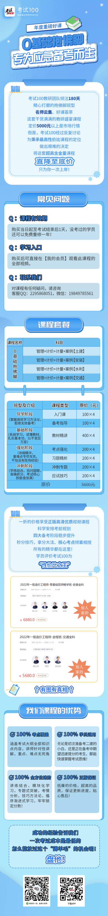 1.本课程为全科套餐班含《专业计量》+《案例》+《管理》+《计价》4科的组合套餐班级(4科的【教材精讲】+【习题课程】+考点强化课程+应试技巧班+模考点题班特色全名师授课;分阶段学习;逐步浓缩考点,直击考试要点! 2.按照教材大纲讲解考点重点;识别知识误区,避免考试落入陷阱;详细分析讲解各类考点题型;掌握命题规律; 3.对课程有任何疑问,请咨询QQ:2295868051,电话:0755—26506094 4.该课程使用时间为第二年的考试当天(比如2025年3月购买,则可以看到26年考试当天),购买后可直接在【我的会员】观看!。 5.感谢购买,考试100作为公益企业10年来已援建10+2所希望小学。