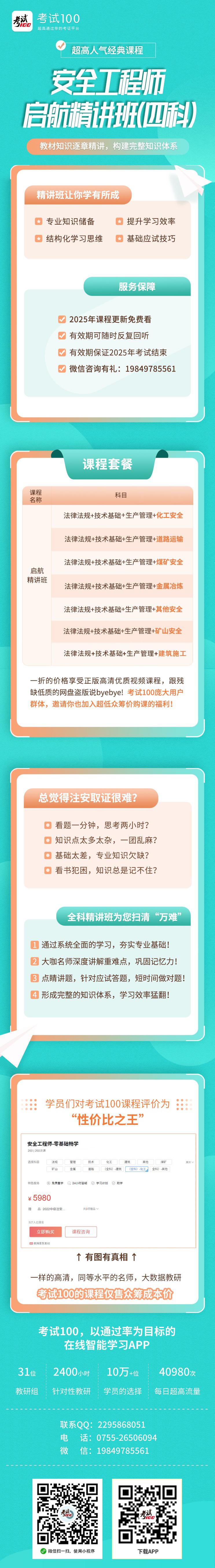 1.该课程为最新安全工程师课程专业实务+管理+法规+生产技术四科的精讲套餐班课程,按照最新考纲,系统梳理教材知识点,针对性分析与讲解,构建学习体系,掌握核心考点,打牢备考基础,通关靠谱! 2、有效期为:为一年,开通本课程会员即可观看该课程全部视频内容。 3、感谢购买,考试100作为公益企业10年来已援建10+2所希望小学。