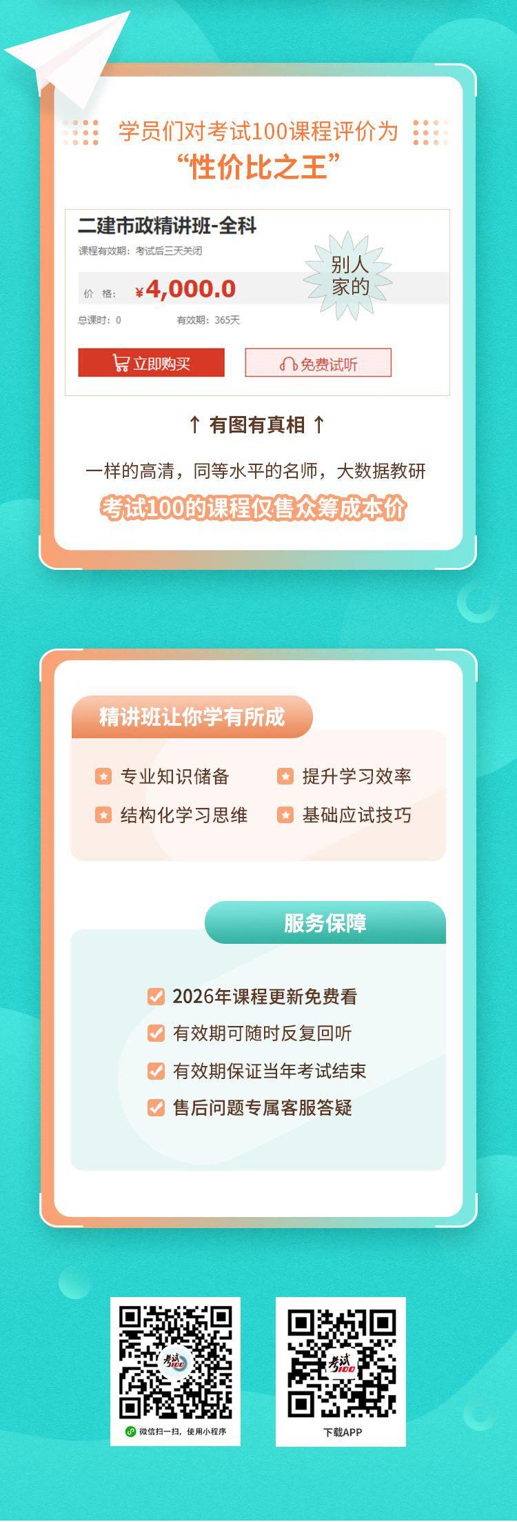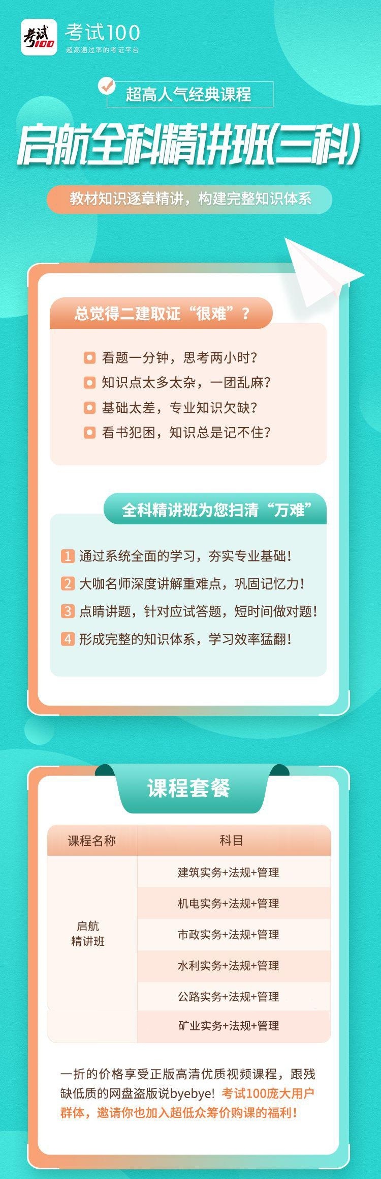 1、该课程为二建全科实物+公共科共三科的教材精讲套餐班课程,按照最新考纲,系统梳理教材知识点,针对性分析与讲解,构建学习体系,掌握核心考点,打牢备考基础,通关靠谱! 2、有效期:自购买日开始算360天,开通本课程会员有效期内更新的视频内容免费看。 3、感谢购买,考试100作为公益企业10年来已援建10+2所希望小学。