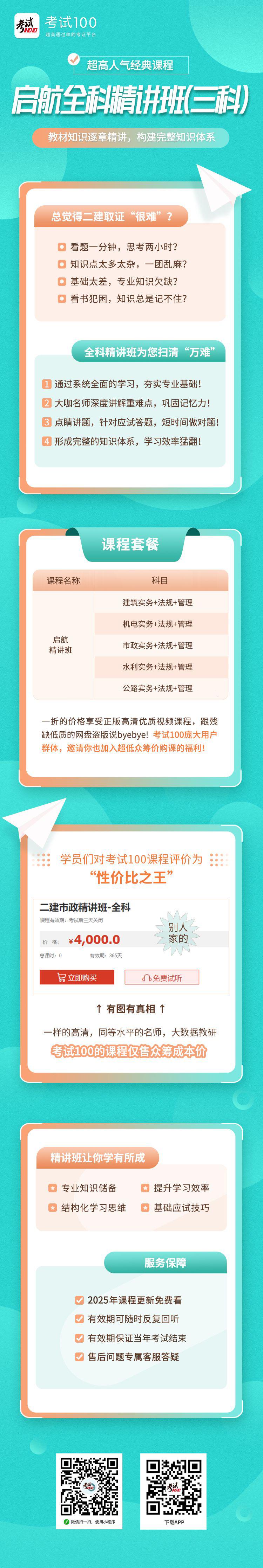 1、该课程为二建市政实务+管理+法规三科的精讲套餐班课程,按照最新考纲,系统梳理教材知识点,针对性分析与讲解,构建学习体系,掌握核心考点,打牢备考基础,通关靠谱! 2、有效期分为1年和2年的,开通本课程会员有效期内更新的视频内容免费看。 3、感谢购买,考试100作为公益企业10年来已援建10+2所希望小学。