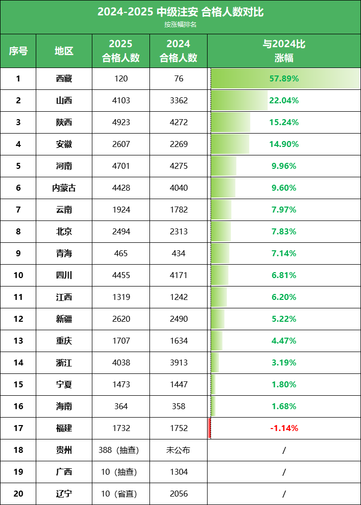 由此可见,除了贵州、广西、辽宁因数据不全不做对比之外,只有福建的2025年合格人数比2024年有所减少,其余省份都比2024年增加。
