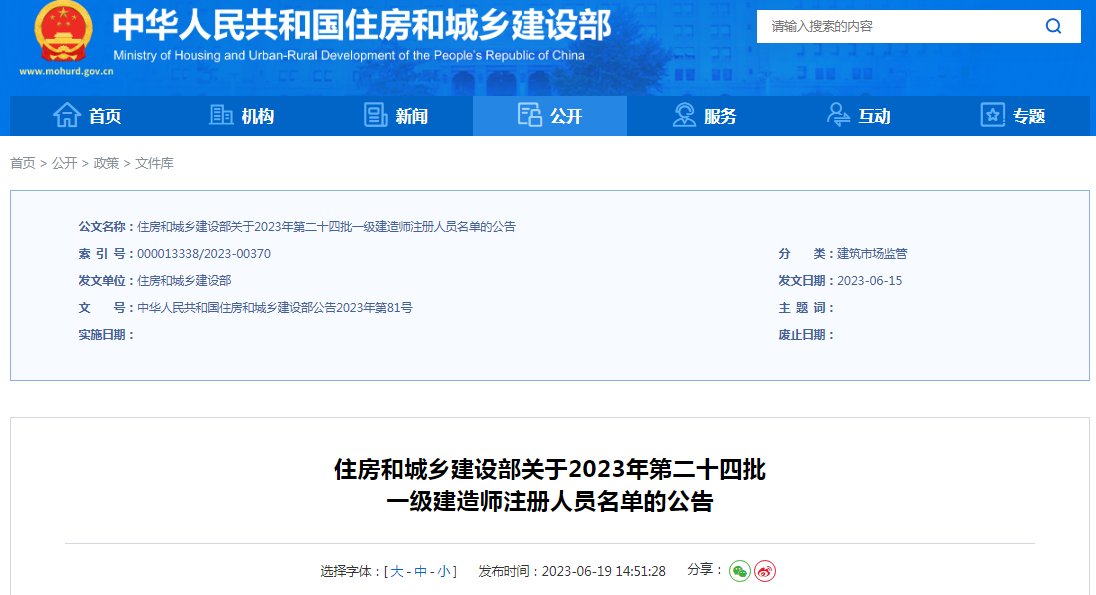 近日,中华人民共和国住房和城乡建设部发布《关于2023年第二十四批一级建造师注册人员名单的公告》,本批次共15737人符合一级建造师注册条件,其中,初始注册共4201人,延续注册2164人,增项注册728人,重新注册8644人。