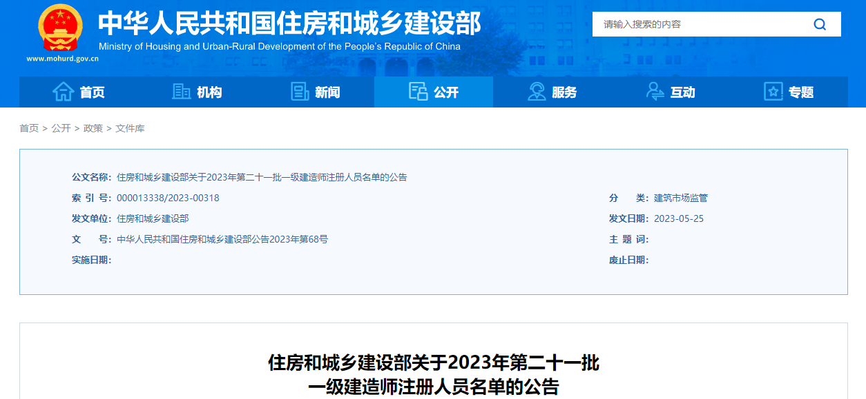 近日,中华人民共和国住房和城乡建设部发布《住房和城乡建设部关于2023年第二十一批一级建造师注册人员名单的公告》,34146名申请一级建造师注册的人员符合注册条件,准予注册。