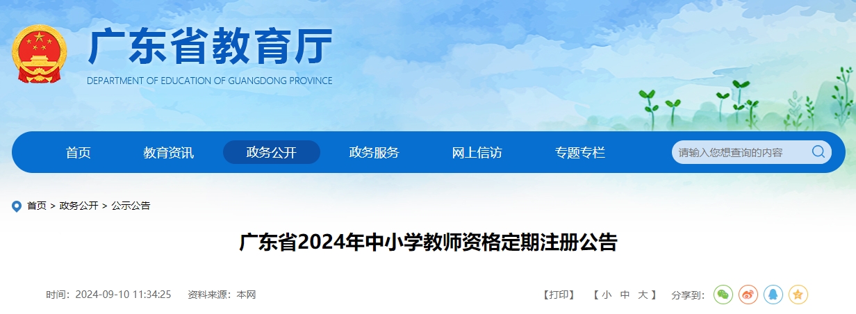 9月10日,广东省教育厅发布了《广东省2024年中小学教师资格定期注册公告》,当中明确了2024年中小学教师资格定期注册网上报名时间10月25日9:00至11月4日17:00。