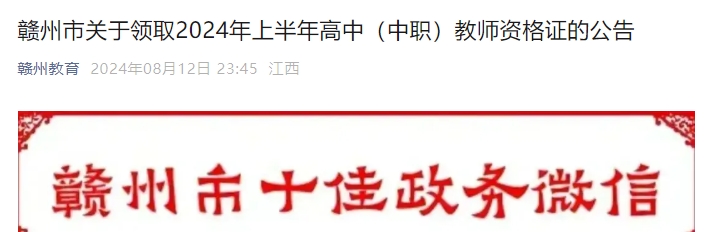 《赣州市关于领取2024年上半年高中(中职)教师资格证的公告》内容如下: