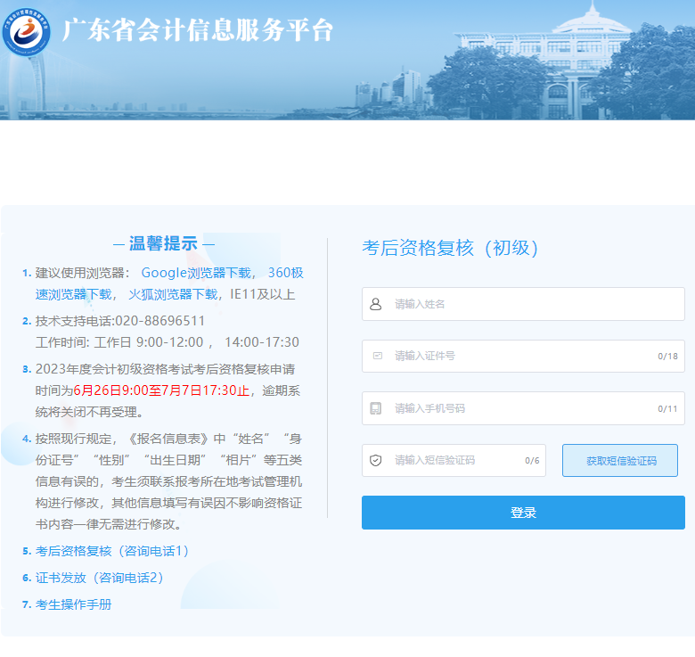 广东地区考生注意:根据广东省财政厅发布《广东省财政厅关于开展2023年度会计初级资格考试考后资格复核等有关事项的通知》可知:2023年度初级会计考后网上资格审核入口开通时间6月26日9:00至7月7日17:30期间登录广东省会计信息服务平台进行线上办理,逾期系统将关闭不再受理复核申请。