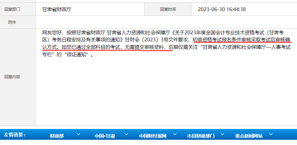 网友您好,按照甘肃省财政厅 甘肃省人力资源和社会保障厅《关于2023年度全国会计专业技术资格考试(甘肃考区)考务日程安排及有关事项的通知》甘财会〔2023〕3号文件要求,初级资格考试报名条件审核采取考试后审核确认方式。如您已通过全部科目的考试,无需提交审核资料,后期仅需关注“甘肃省人力资源和社会保障厅——人事考试专栏”的“领证通知”。