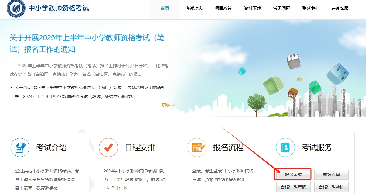 考生在规定时间内登陆中小学教师资格考试网(ntce.neea.edu.cn)。进入官网后,在右下角"考生服务"区点击"在线报名",进入报名系统。